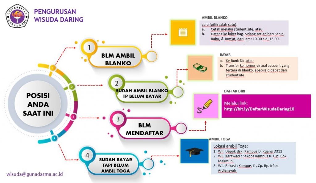 - Proses pendaftaran Wisuda Daring dapat dilakukan melalui form online pada URL: yang dapat diisi oleh setiap calon wisudawan/wati.