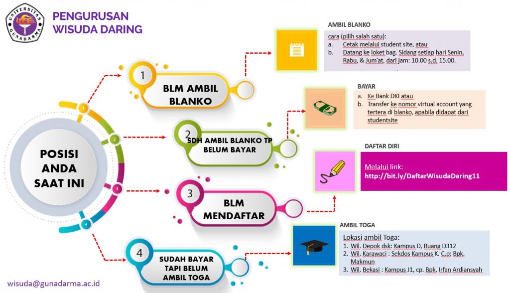 - Proses pendaftaran Wisuda Daring dapat dilakukan melalui form online pada URL: yang dapat diisi oleh setiap calon wisudawan/wati.
