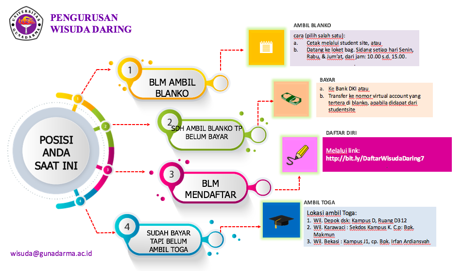 - Proses pendaftaran Wisuda Daring dapat dilakukan melalui form online pada url: http://bit.ly/DaftarWisudaDaring7 yang dapat diisi oleh setiap calon wisudawan/wati.