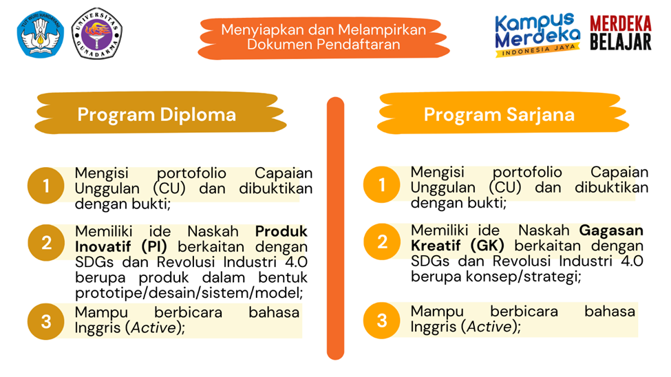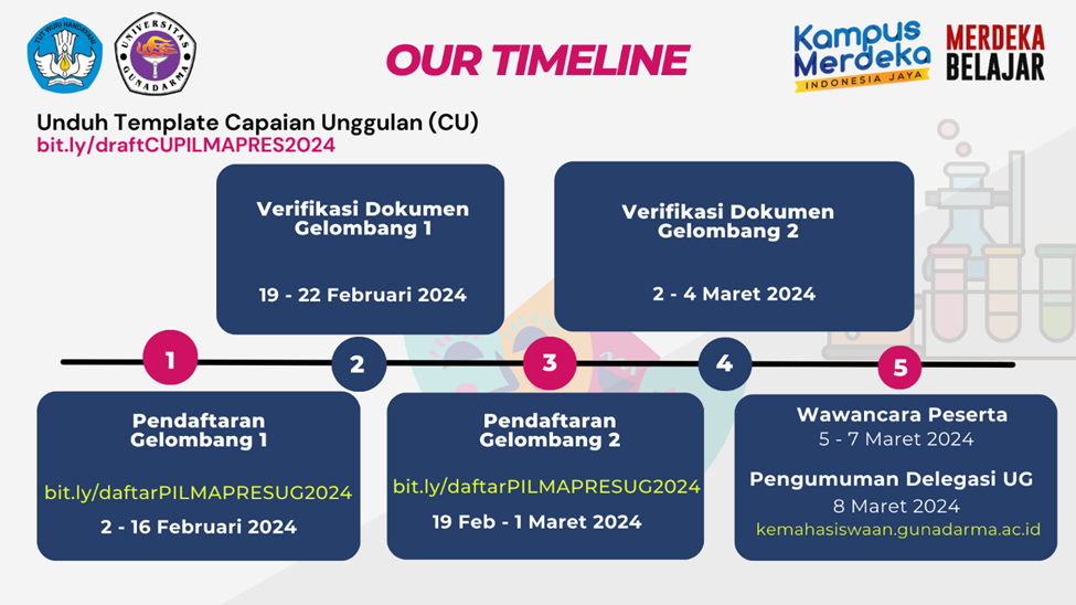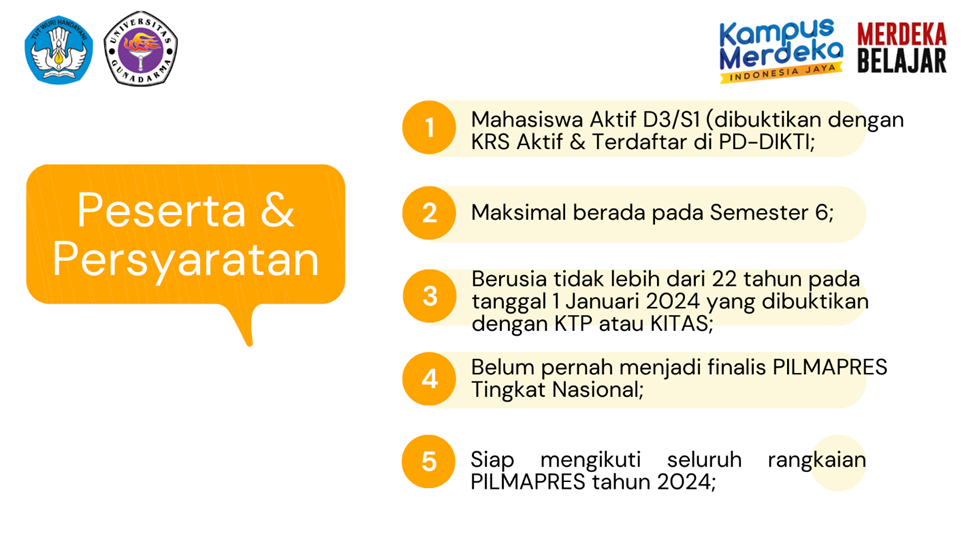Pada PILMAPRES tahun 2024 bagi peserta Program Diploma dan Sarjana menyinergikan asesmen berbagai kemampuan yang diperlukan di masyarakat. Penilaian keunggulan mahasiswa berprestasi akan dievaluasi dari aspek pengetahuan dan keterampilan serta keterampilan hidup, diantaranya komunikasi, kolaborasi, berpikir kritis, kreativitas, dan karakter unggul lainnya. Di samping itu, tata cara pemilihan akan dilakukan secara berjenjang, berprinsip kesetaraan, serta berasas keterwakilan wilayah yang dilanjutkan dengan pembekalan keterampilan hidup di tahap final. Sehubungan dengan hal tersebut, kami membuka pendaftaran seleksi delegasi Universitas Gunadarma untuk PILMAPRES Program Diploma dan Sarjana Tahun 2024 dengan persyaratan dan pendaftaran kompetisi sebagai berikut: