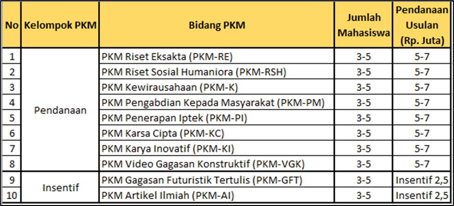 - PKM Pendanaan, terdiri dari 8 bidang PKM, yaitu: PKM-RE; PKM-RSH; PKM-K; PKM-PM; PKM-PI; PKM-KC; PKM-KI; dan PKM-VGK.
