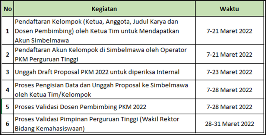 Bagi kelompok mahasiswa yang berminat untuk mengikuti PKM Tahun 2022 dapat mengisi, mendaftarkan Tim, dan mengunggah softfile draft proposal melalui link berikut ini: